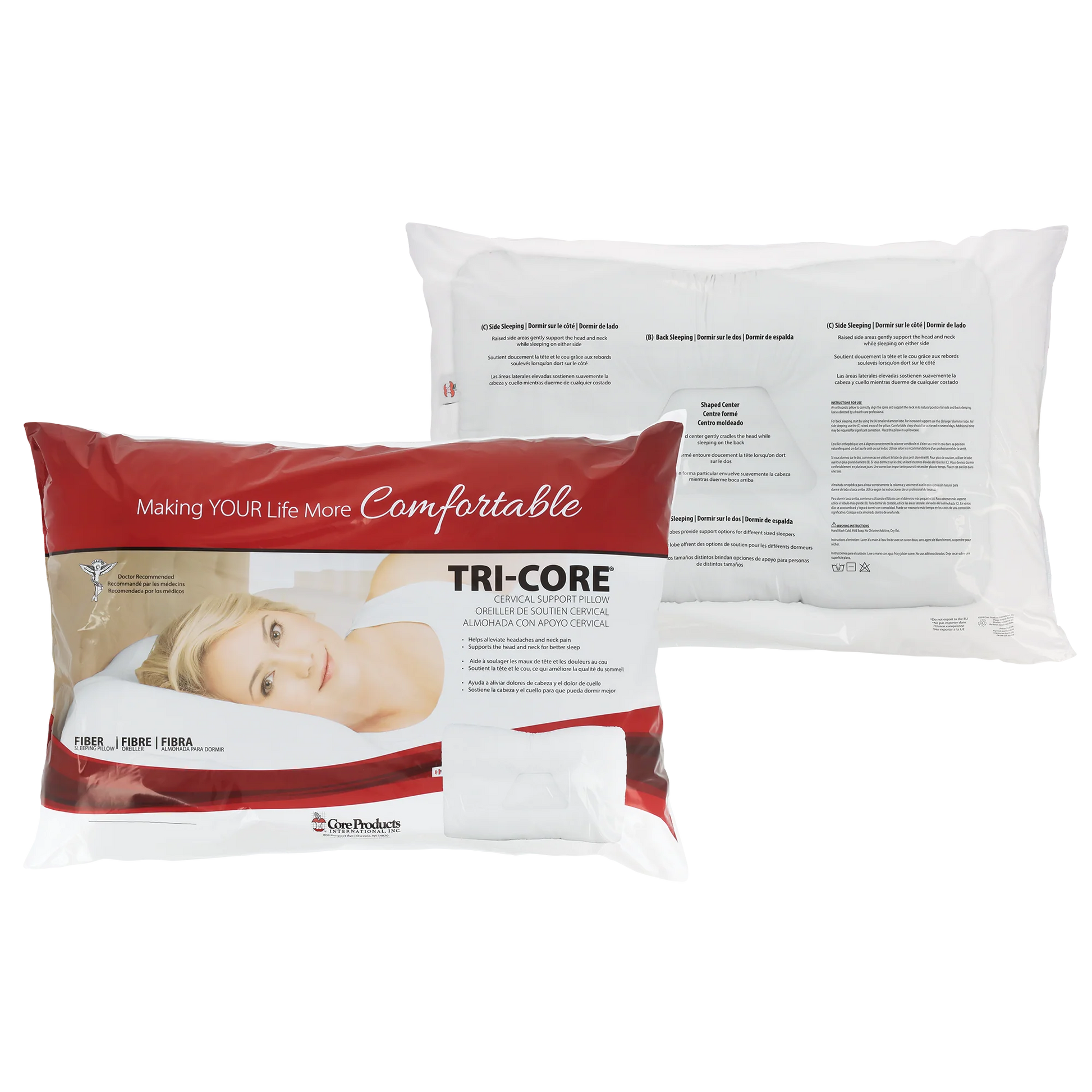 This fiber filled support neck pillow is the highest quality cervical neck support pillow available. As you sleep, the Tri Core Cervical Support Neck Pillow cradles your neck in its most natural and neutral position. The down-like feel of this neck pillow provides lasting freshness, excellent neck support and superior pillow life. Designed for either back or side sleeping. The Tri-Core is the #1 fiber support neck pillow recommended by the medical professionals such as Chiropractors and Physical Therapists who most commonly treat neck and head pain. In addition to alleviating pain caused by many conditions, this neck pillow also alleviates airway blockage, which can be a major cause of snoring may also be helped.Most of our customers experience an increase in sleeping comfort within a couple of days of using this pillow. Others may require up to two weeks before the neck and back muscles adjust to their proper position.